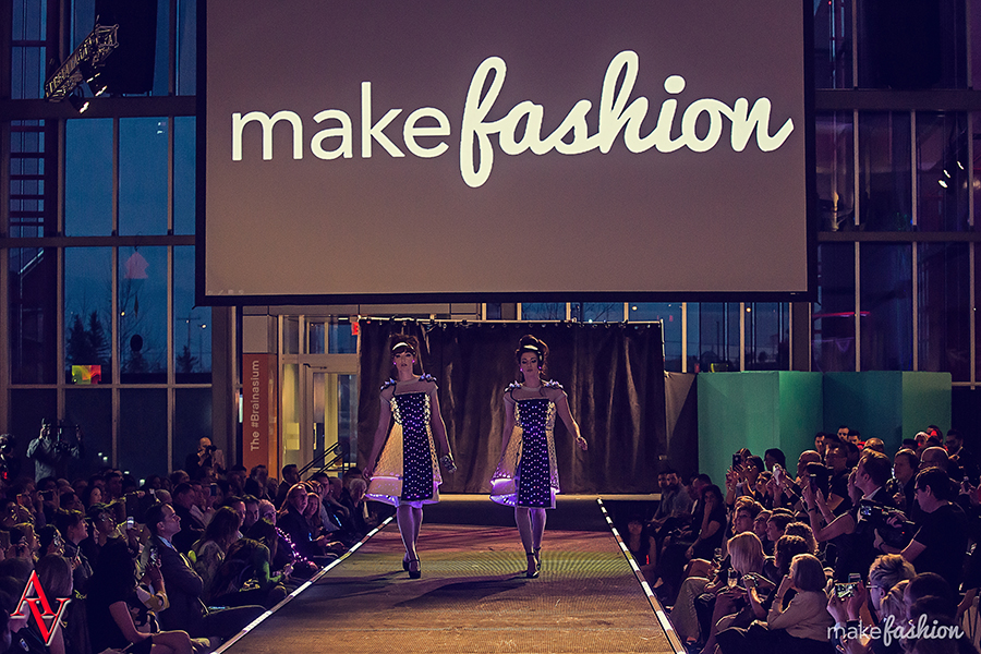 Phi : Illuminated Design is a new-media collective focusing on performance, wearable art, and wearable technology. Interested in the crossroads between art, fashion, and technology, Phi is constantly seeking methods and media that engage and empower cultural participants through technology. Members Stacey Morgan and Kenzie Housego met while attending the Alberta College of Art and design, where they both received their Bachelors of Fine Art. In 2013 Kenzie and Stacey began collaborating on their first wearable tech collection Illuminated Vintage for the MakeFashion 2014 runway show. This collective featured bright retro dress forms, and accessories, that all react to, sound, touch, movement, or the wearer’s heartbeat. This first MakeFashion runway event was extremely impactful on both artists; in fostering an enthusiasm for fashion technology, exposing them to ‘Maker Culture’ and introducing technology as a new attainable art making medium.